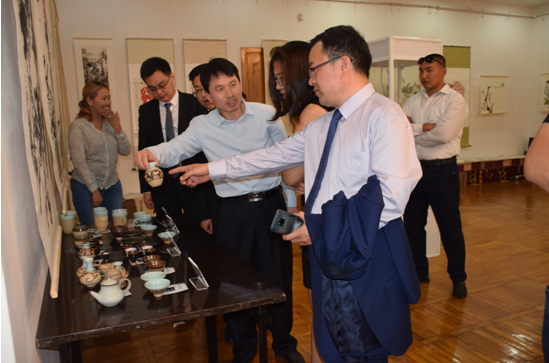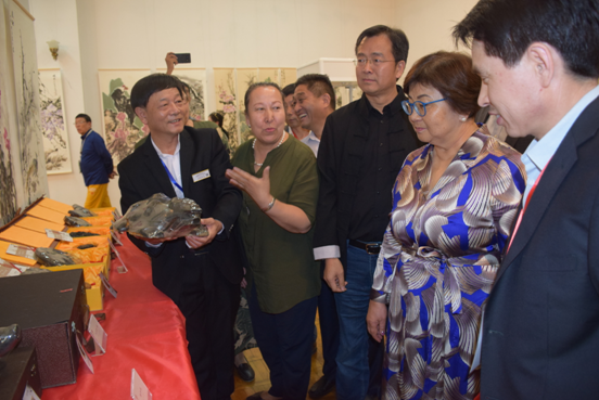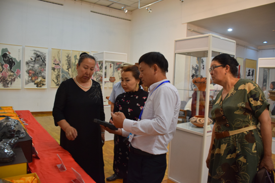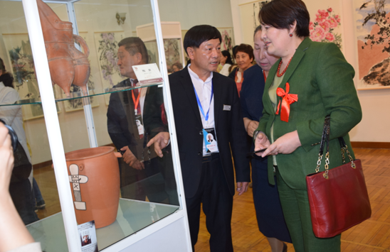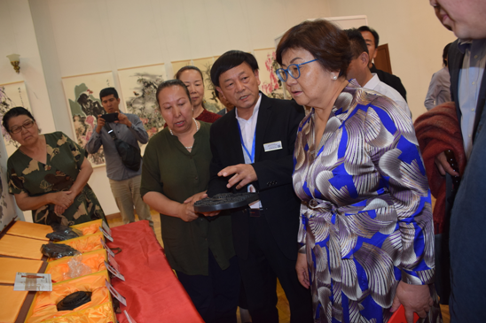 公司總經(jīng)理劉新安為吉爾吉斯斯坦前總統(tǒng)奧通巴耶娃講解黃河澄泥硯《九九歸一硯》